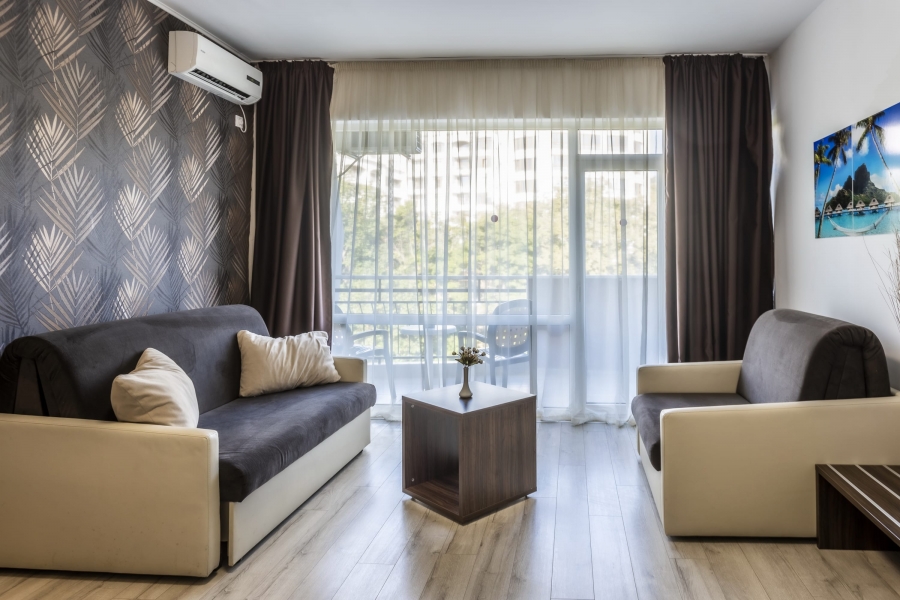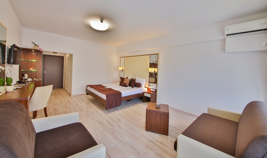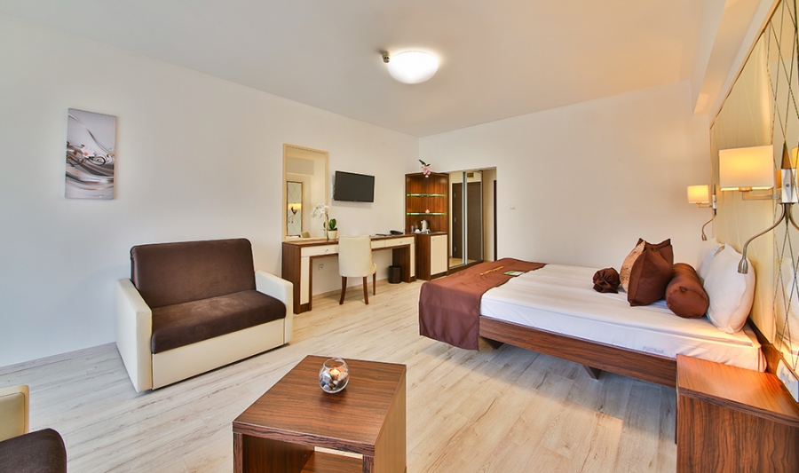 Das Familiendoppelzimmer verfügt über ein Schlafzimmer mit Doppelbett, einen Ruhebereich, ein eigenes Bad und einen Balkon mit Gartenmöbeln. Das Zimmer ist mit einer Klimaanlage, einem Safe, einem Minikühlschrank, einem Wasserkocher, Internet, einem Fernseher mit Satellitenkanälen, einer Dusche und/oder Badewanne im Badezimmer, einem Haartrockner und Toilettenartikeln ausgestattet.