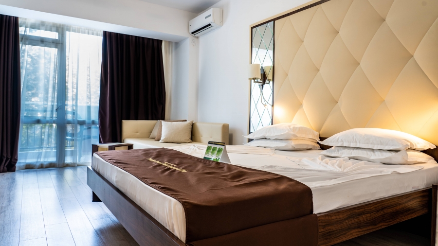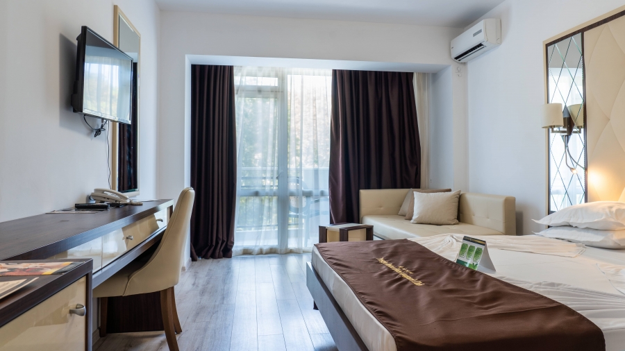 Das Doppelzimmer Deluxe verfügt über ein Schlafzimmer mit Doppelbett, einen Ruhebereich, ein eigenes Bad und einen Balkon mit Gartenmöbeln. Das Zimmer ist mit einer Klimaanlage, einem Safe, einem Minikühlschrank, einem Wasserkocher, Internet, einem Fernseher mit Satellitenkanälen, einer Dusche und/oder Badewanne im Badezimmer, einem Haartrockner und Toilettenartikeln ausgestattet.